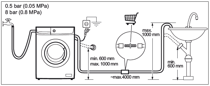 The height of the drain must be no more than 100 cm and no less than 60 cm above the base of the machine or as shown in the user manual.