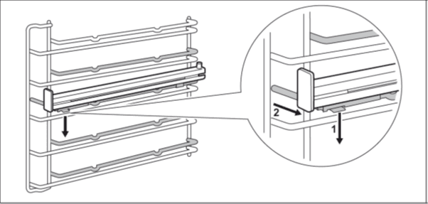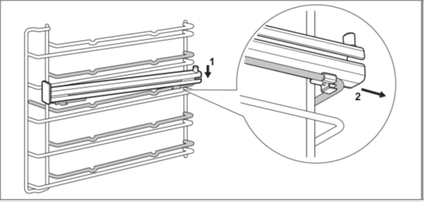 Push down on the locking tab located at the front bottom of each runner then move the runner away from the shelf support as detailed below.